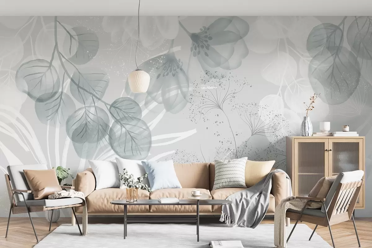 Fotomurales Elementos florales de eucalipto en tonos azules y blancos con hojas y pétalos superpuestos de estilo minimalista Nr. w08599