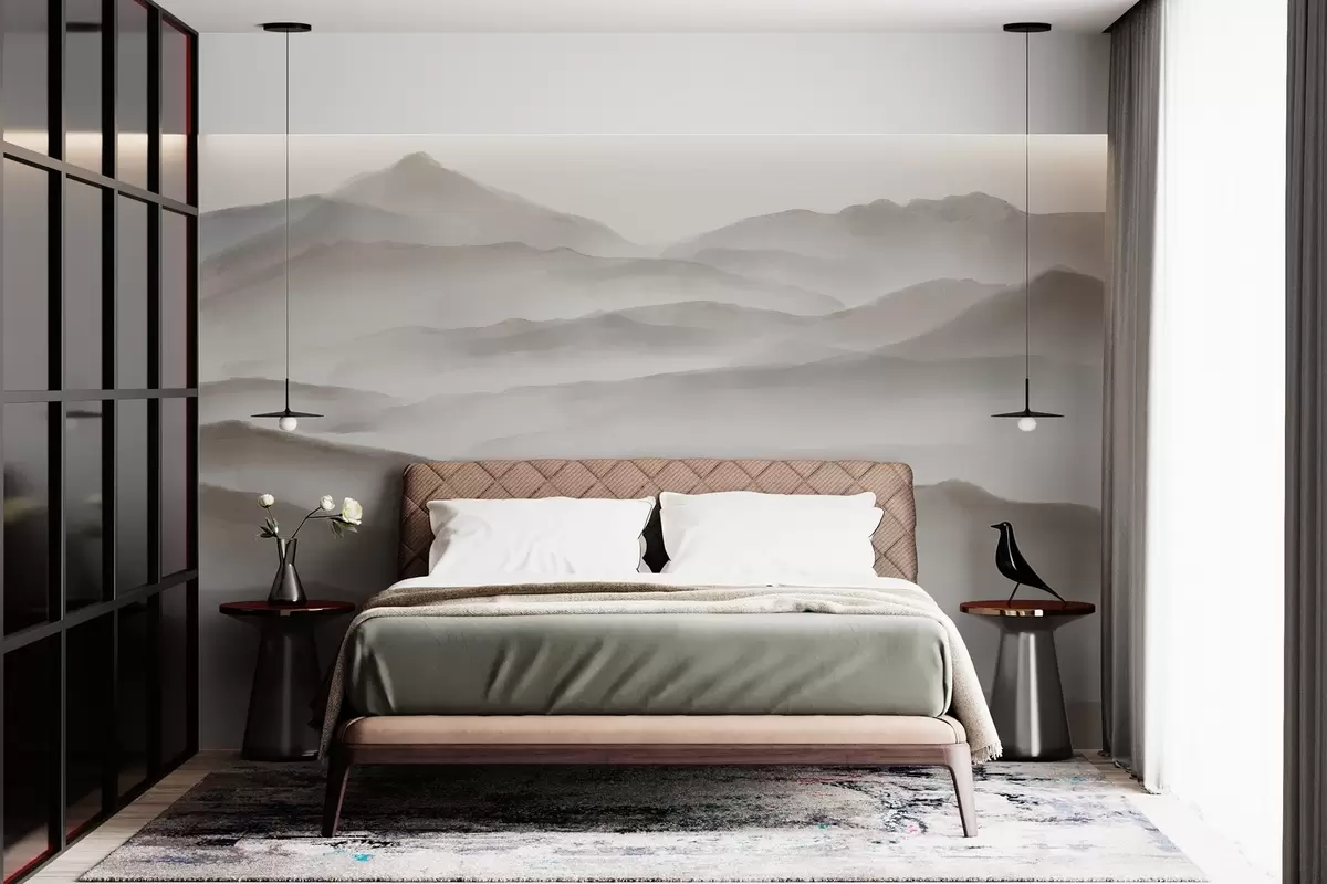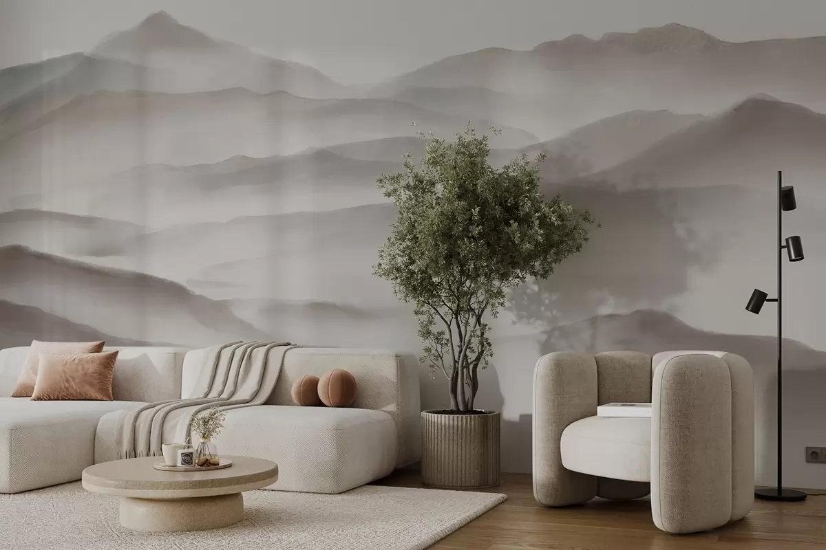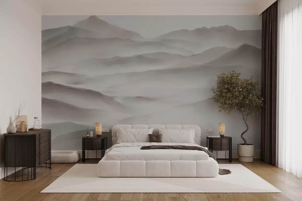 Fotomurales Paisaje montañoso minimalista con colinas ondulantes y niebla , creando una impresión serena y atmosférica Nr. w08602