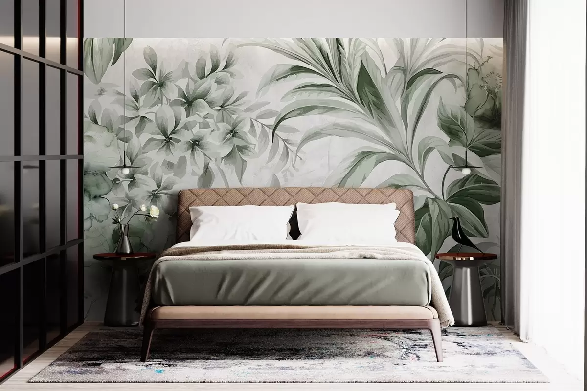 Fotomurales Hojas y follaje tropicales en una paleta apagada que va de tonos claros a oscuros de verde sobre fondo claro texturizado Nr. w08650
