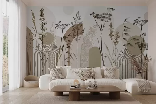 Fotomurales Colección de plantas y flores en tonos neutros sobre fondo de arco abstracto en suaves tonos beige y marrón Nr. w08665