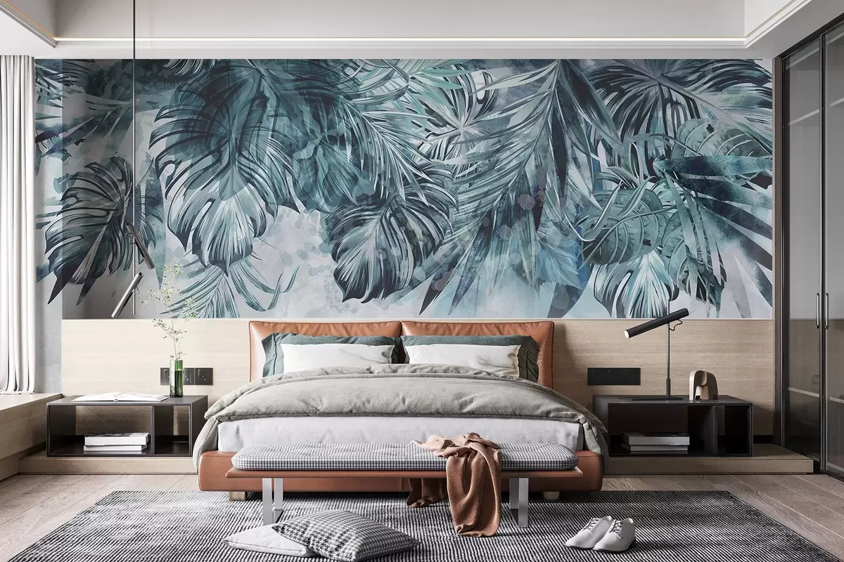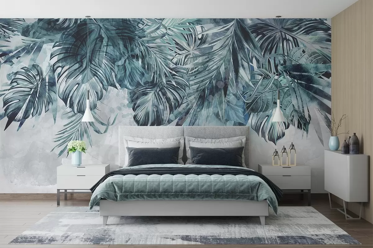 Fotomurales Hojas tropicales en tonos verde azulado y verde, en cascada desde la parte superior, sobre un fondo claro y texturizado Nr. w08667