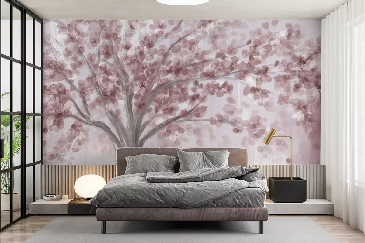 Fotomurales Un gran árbol con hojas suaves y abstractas de color rosa sobre un fondo claro y neutro que realza los tonos del árbol Nr. w08669v2