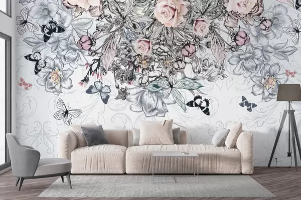 Fotomurales Un dibujo floral con rosas rosadas y varias flores y mariposas con intrincado arte lineal sobre fondo texturizado Nr. w08674