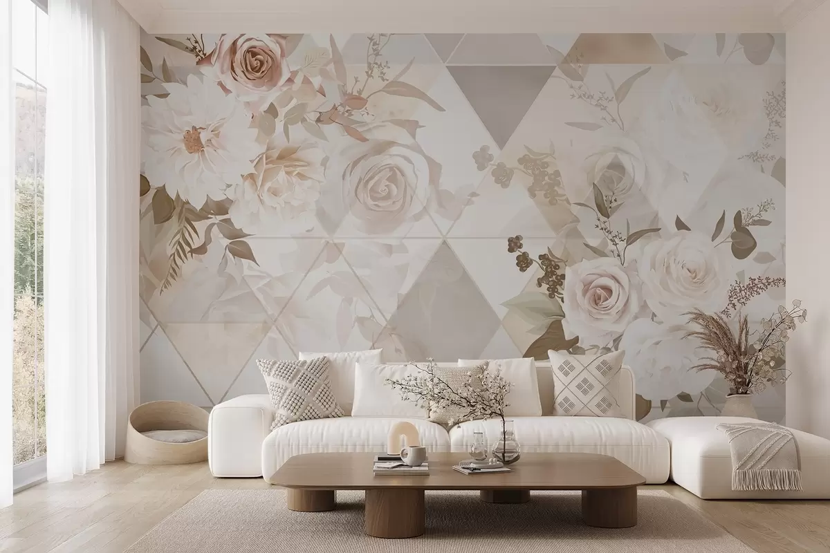 Fotomurales Ramos de rosas y peonías sobre fondo estampado en tonos beige claro Nr. w08679