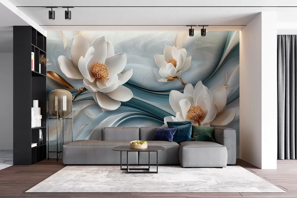 Fotomurales Flores de magnolia combinadas con tonos azules, blancos y amarillos con ondas abstractas Nr. w08695