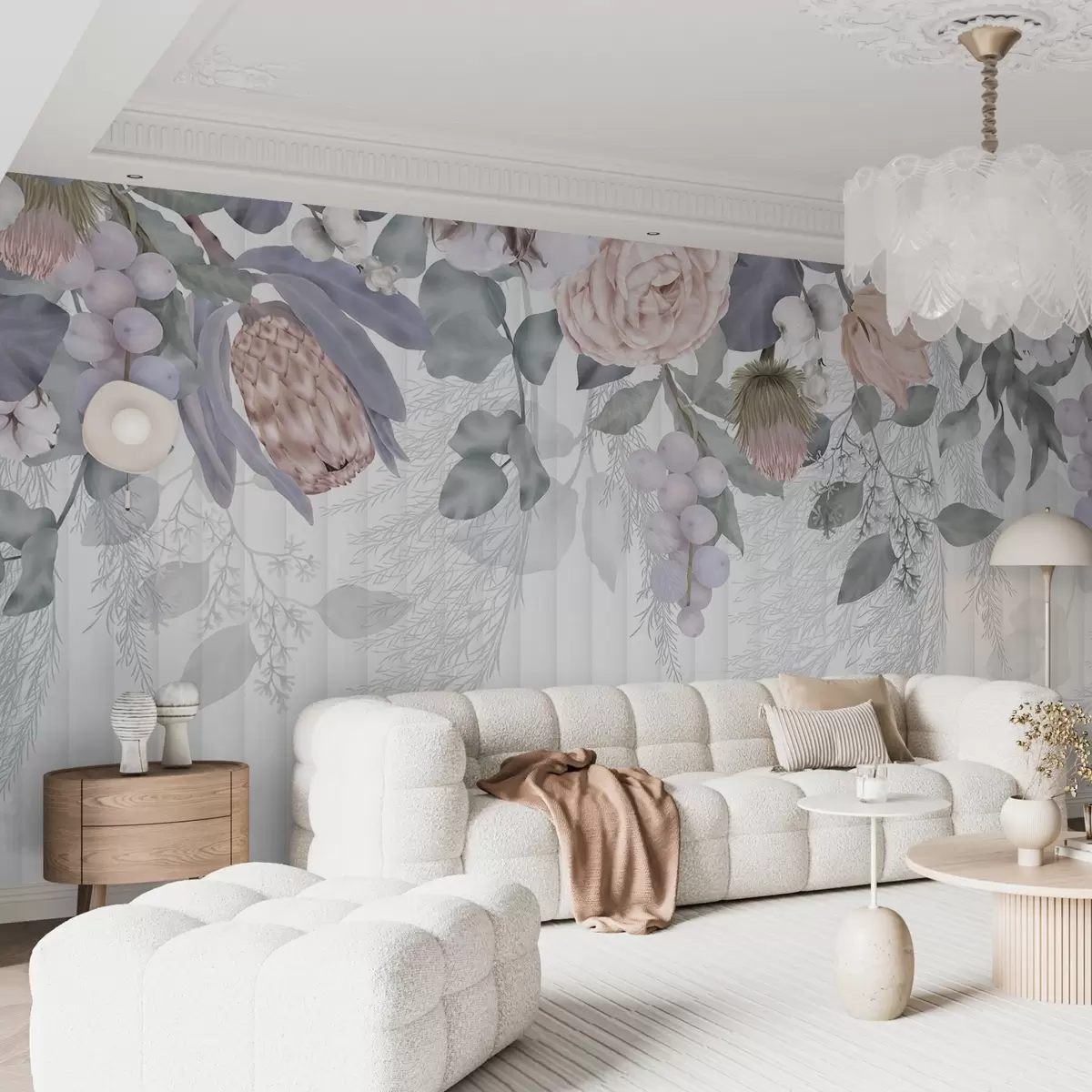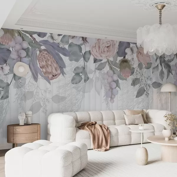 Fotomurales Un floral de rosas rosadas en tonos pastel, flores de protea, ramas de eucalipto y bayas sobre fondo texturizado Nr. w08700