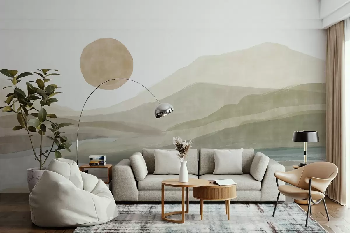 Fotomurales Un paisaje de montañas en capas con una suave pendiente, un río serpenteante, un sol naranja apagado en el cielo Nr. w08702