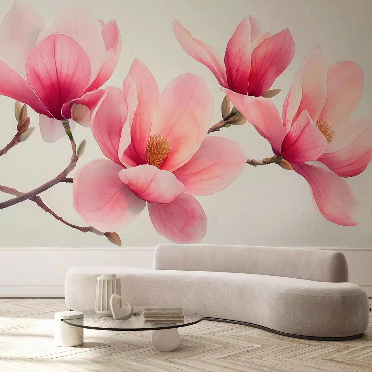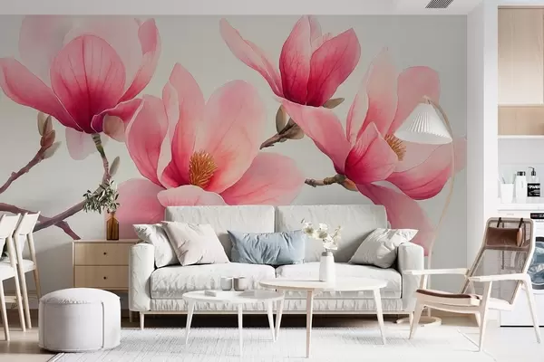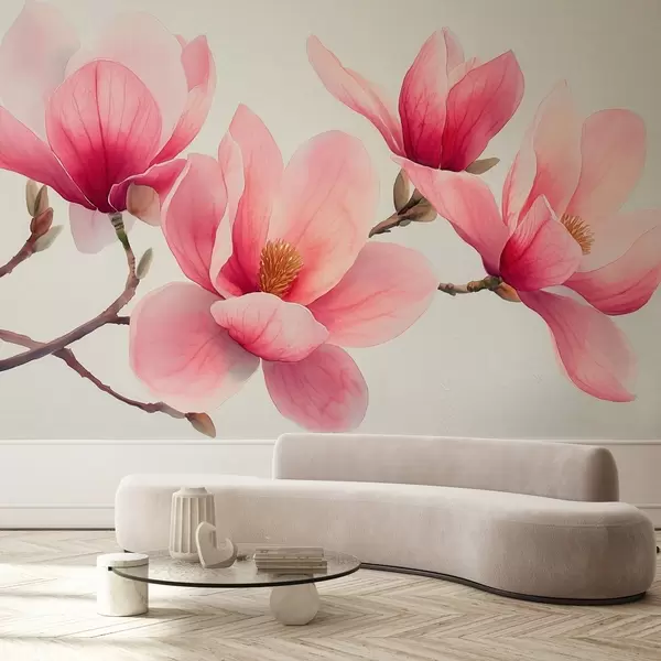 Fotomurales Flores de magnolia rosa de primavera en estilo acuarela sobre fondo gris claro Nr. w08709