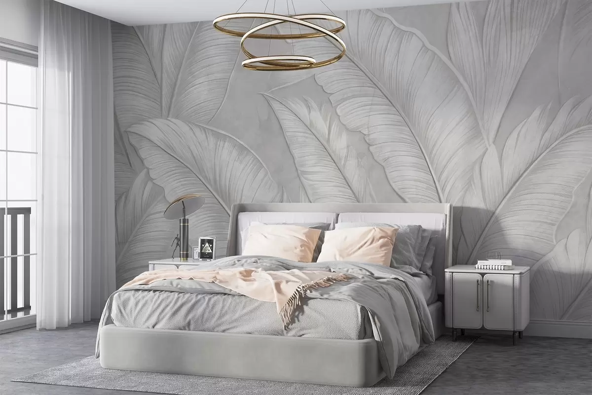 Fotomurales Grandes hojas tropicales detalladas con gran textura en un color gris claro monocromático de estilo loft Nr. w08772