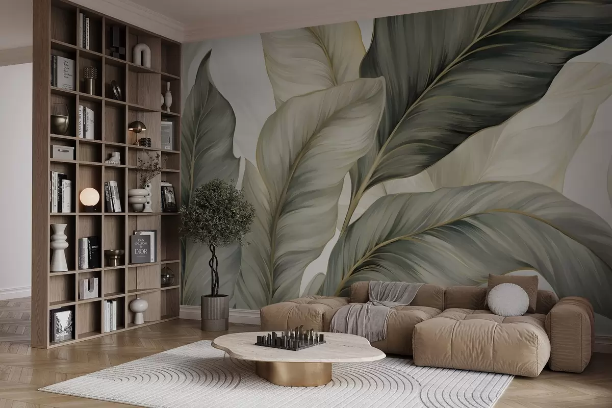 Fotomurales Hojas grandes de textura estilizada con venas detalladas en varios tonos de verde, crema y beige Nr. w08785