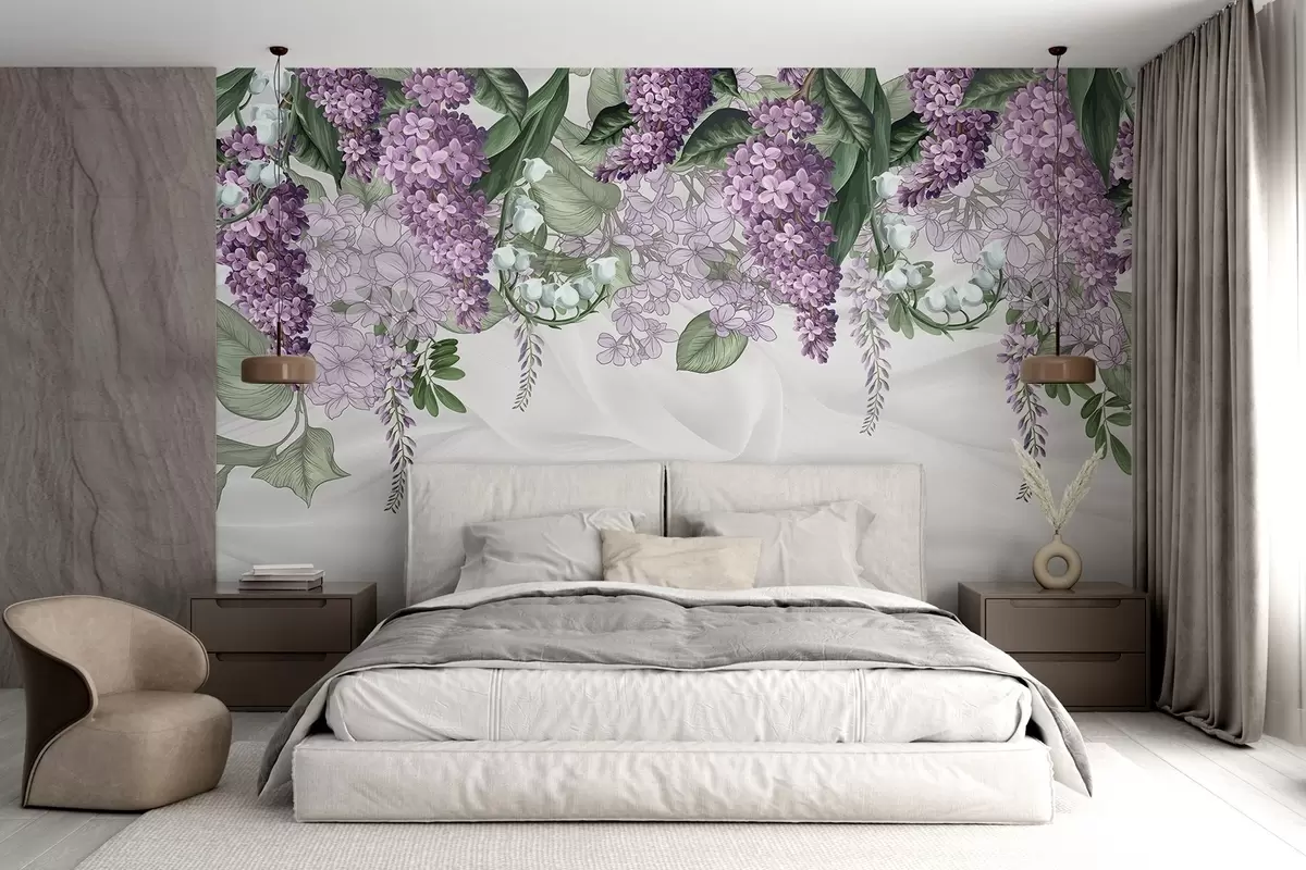 Fotomurales Flores de color lila pastel y hojas verdes sobre fondo blanco con textura de imitacion de seda fabriс Nr. w08825