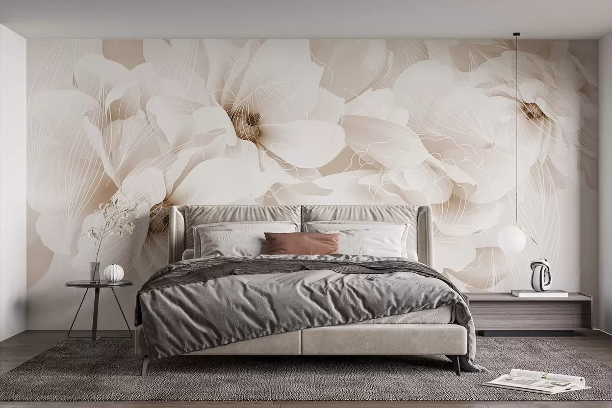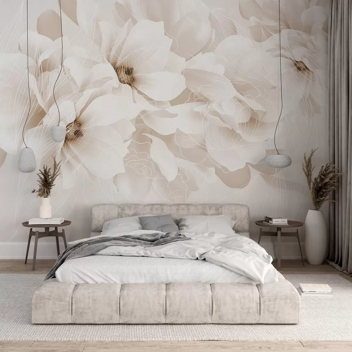 Fotomurales Flores de peonía en tonos pastel con delicados pétalos blancos y beige y líneas blancas sobre fondo beige claro Nr. w08826v1