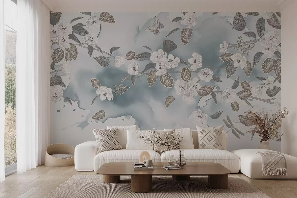 Fotomurales Flor de cerezo rama con flores, hojas, mariposas en una acuarela de color azul claro con textura de fondo Nr. w08831v1