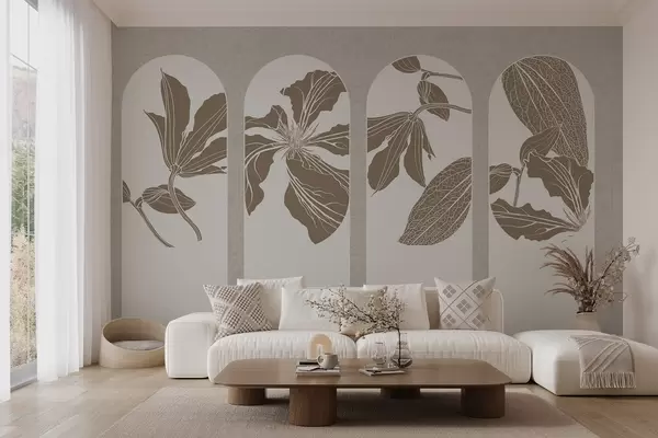 Fotomurales Elegantes arcos con diseños florales en beige y blanco, sobre fondo beige texturado, estilo minimalista Nr. w08866