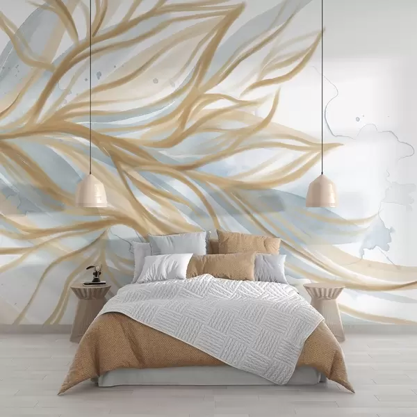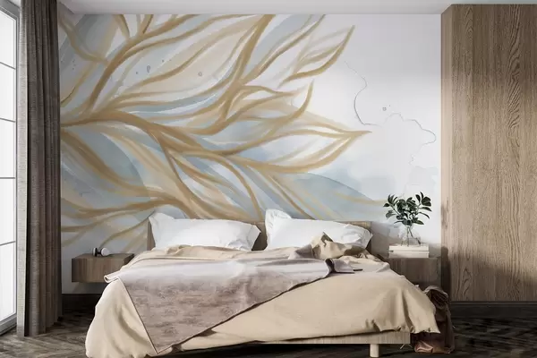 Fotomurales Abstracto hojas amarillas con fondo de acuarela azul, suave y delicado, formas orgánicas, líneas fluidas Nr. w08871