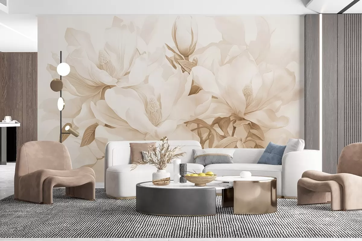 murales de pared Flores de magnolia con pétalos blancos y beige, hojas y ramas marrones, estilo acuarela suave y delicada w08886