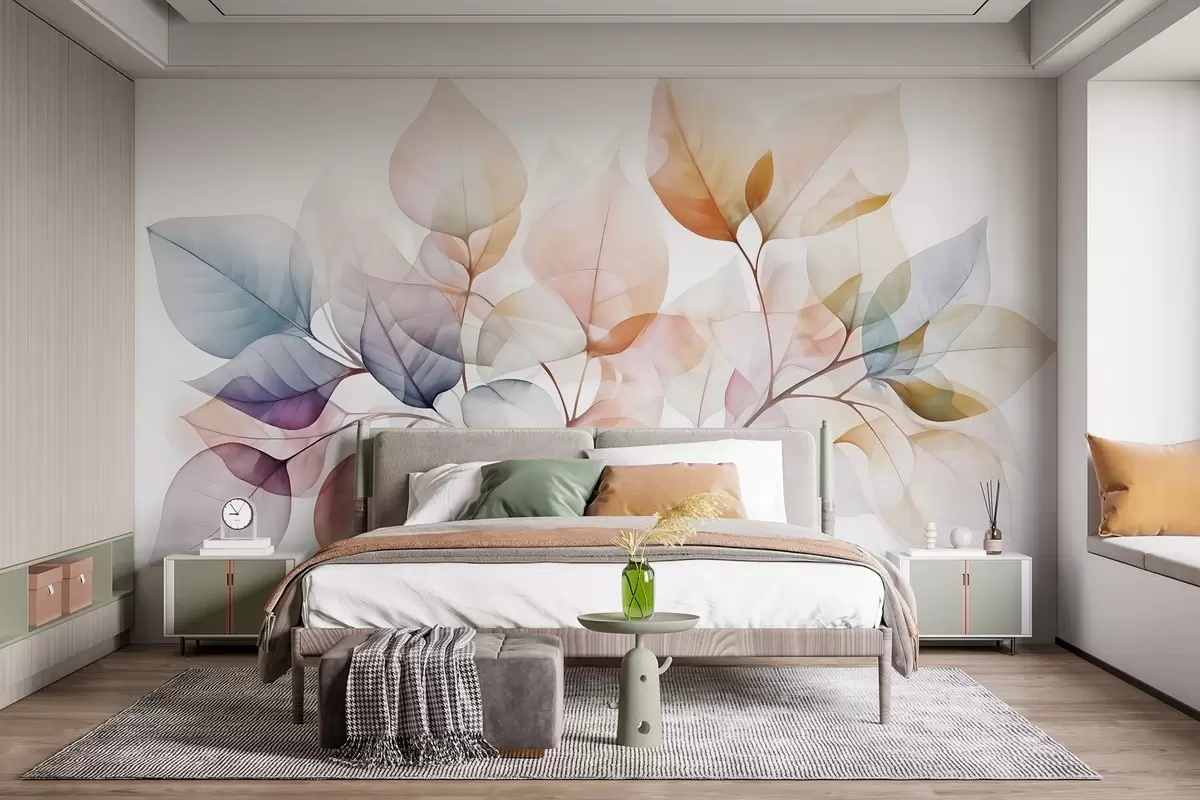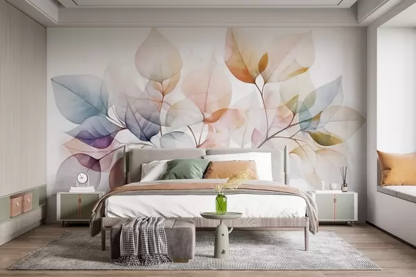 Fotomurales Pintura en acuarela de hojas translúcidas en colores pastel, con tonos rosas, blancos, morados y azules Nr. w08910