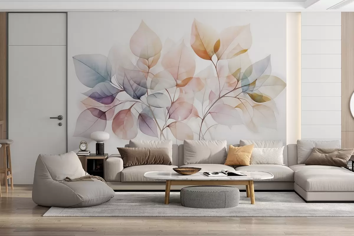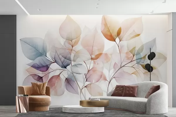 Fotomurales Pintura en acuarela de hojas translúcidas en colores pastel, con tonos rosas, blancos, morados y azules Nr. w08910