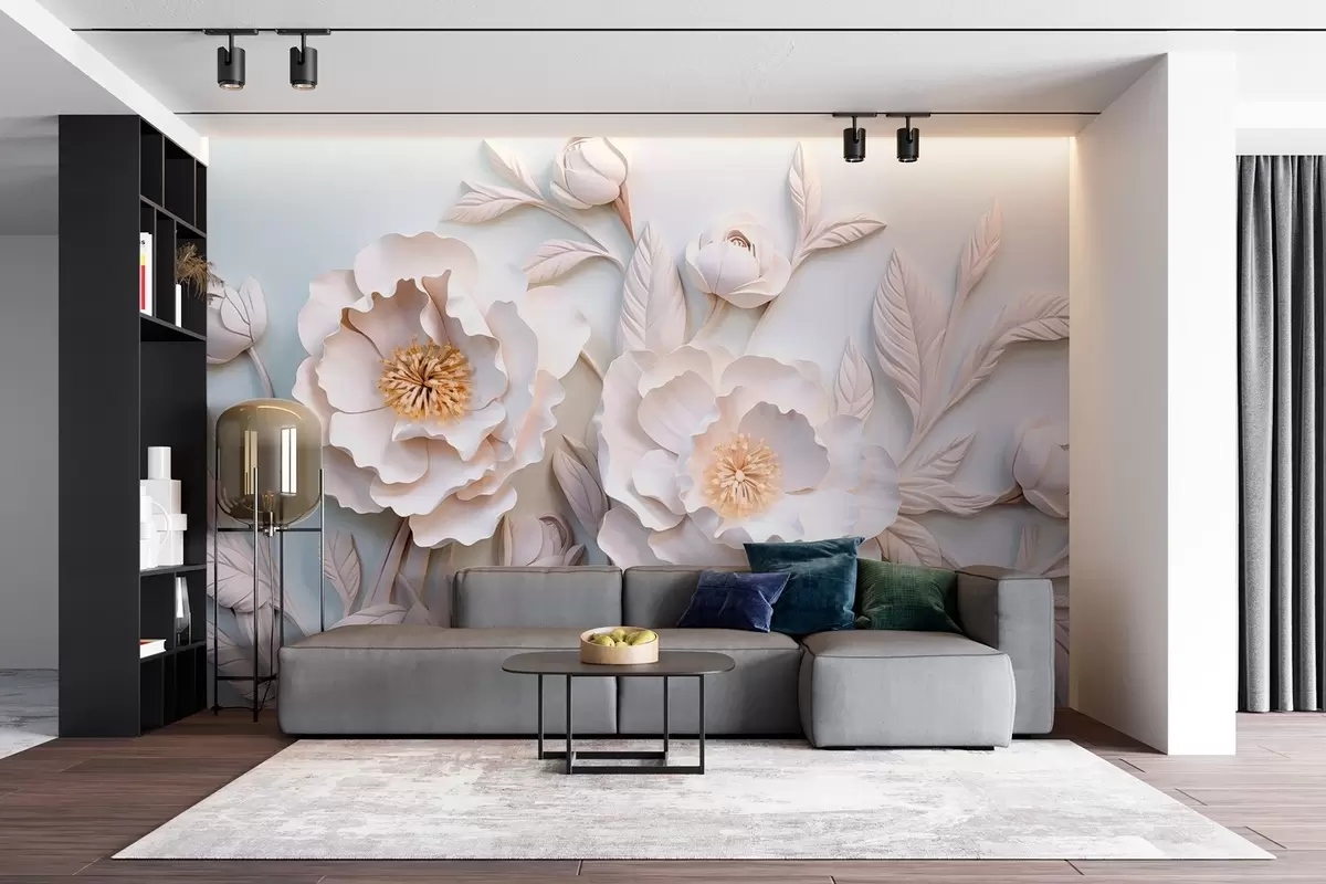 Fotomurales peonías en relieve 3D al fresco con acento amarillo Nr. w08967