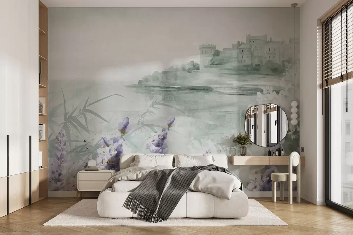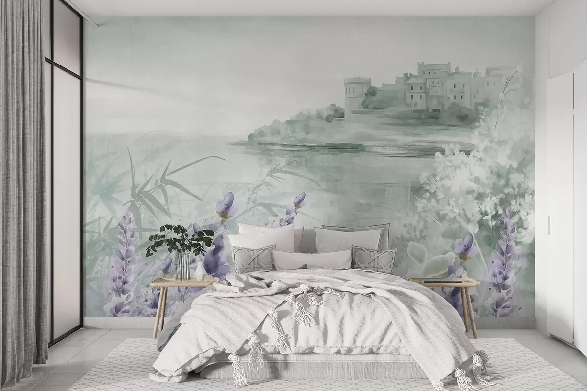 Fotomurales Paisaje vintage texturizado con un castillo sobre un acantilado con vistas al mar, con flores de lavanda en colores apagados Nr. w08975