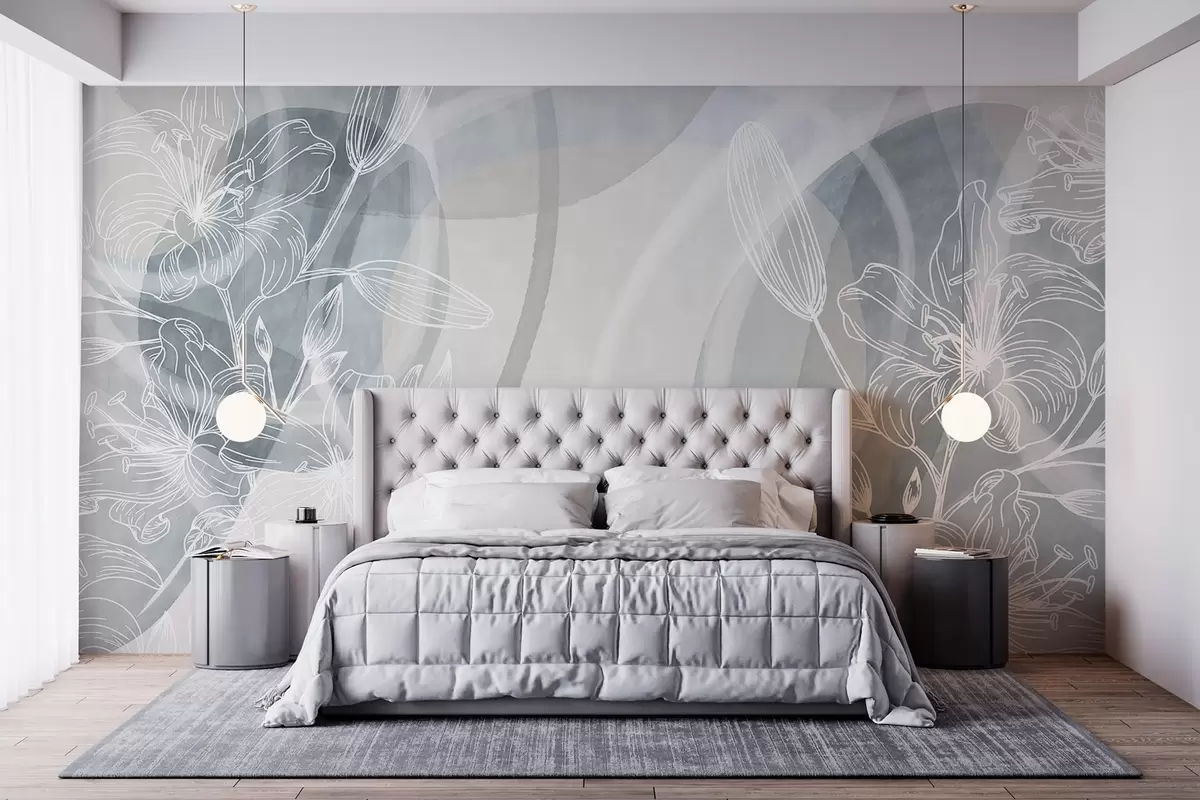 Fotomurales Diseño floral minimalista con flores y hojas blancas, círculos abstractos superpuestos en tonos grises y azules Nr. w08979