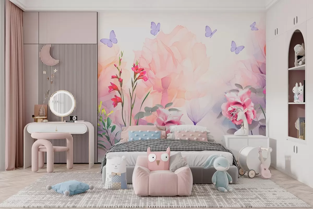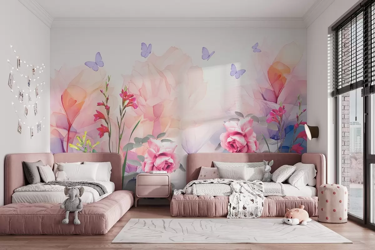 Fotomurales Flores con mariposas y rosas en estilo acuarela Nr. w09002