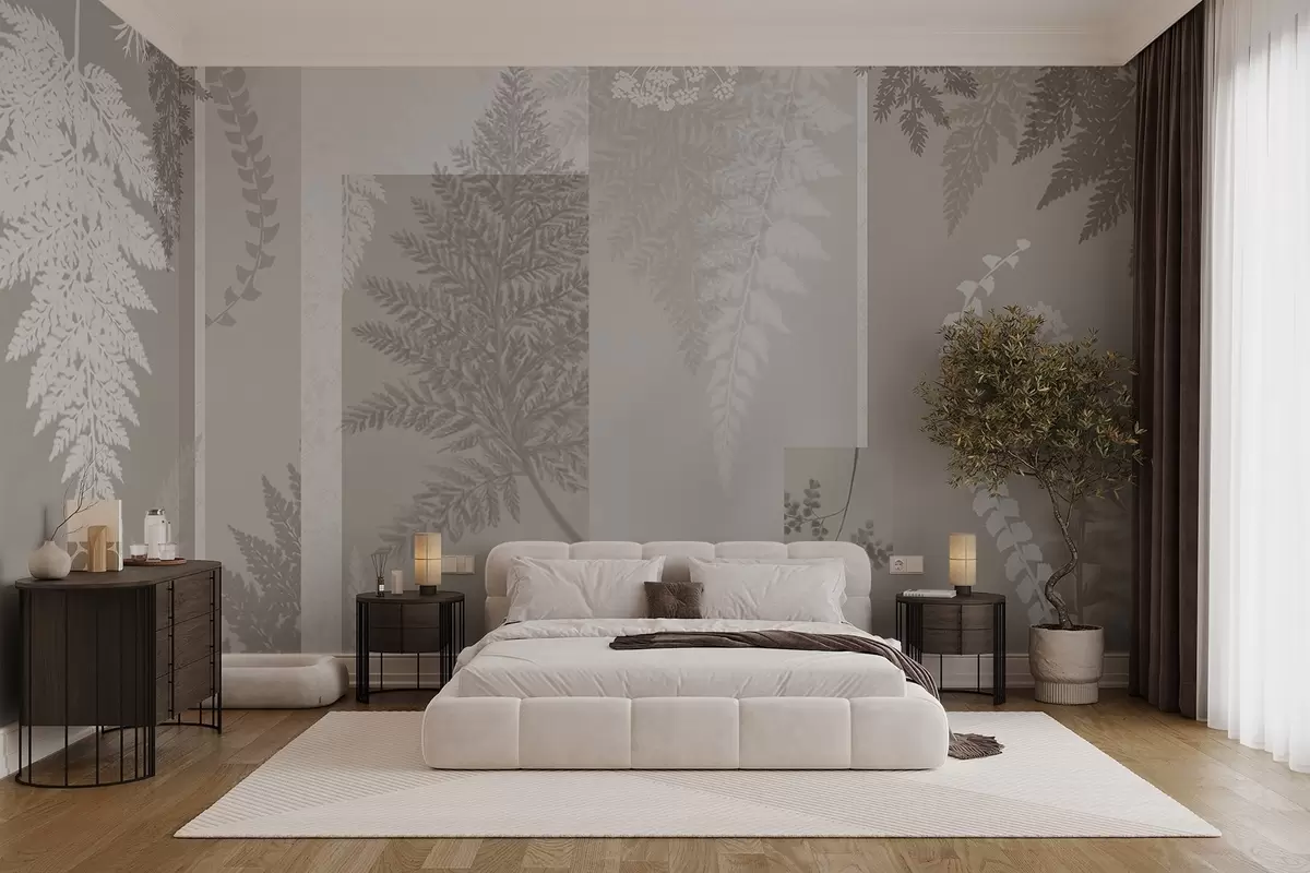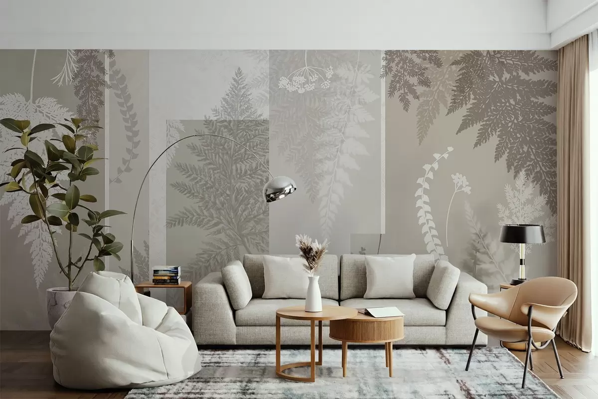 Fotomurales Hojas de helecho en beige y blanco, dispuestas en rayas verticales, creando un estampado botánico y minimalista, de colores suaves y apagados Nr. w09007