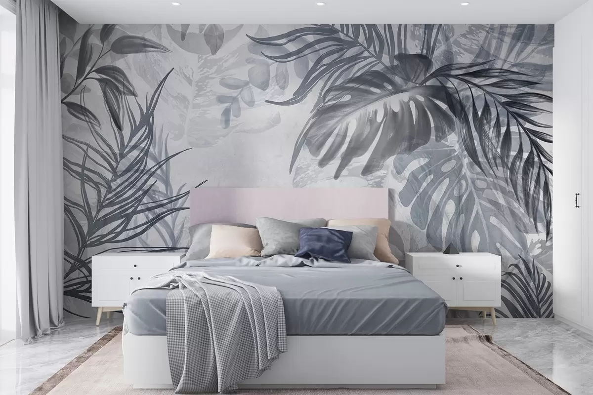 Fotomurales Monstera y hojas de palma en tonos de azul y gris, botánico, follaje tropical, plantas de la selva, fondo texturizado Nr. w09011v1