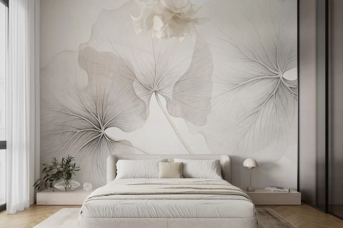Fotomurales Tres hojas translúcidas con venas visibles, con textura de ruido superpuestas ligeramente, con tallos finos sobre fondo blanco Nr. w09052