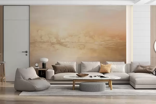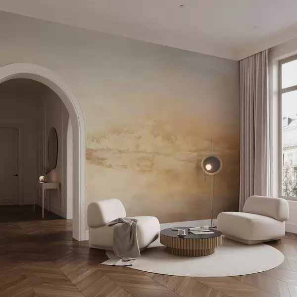 Fotomurales Paisaje abstracto texturizado con colores cálidos, una atmósfera suave y soñadora y una mezcla de tonos naranjas, amarillos y blancos Nr. w09063