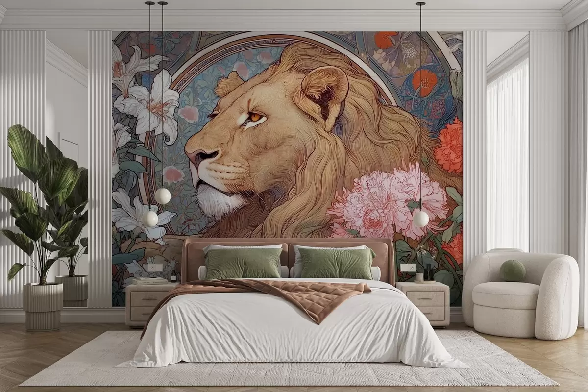 Fotomurales Un león rodeado de muchas flores al estilo de Alphonse Mucha Nr. w09073