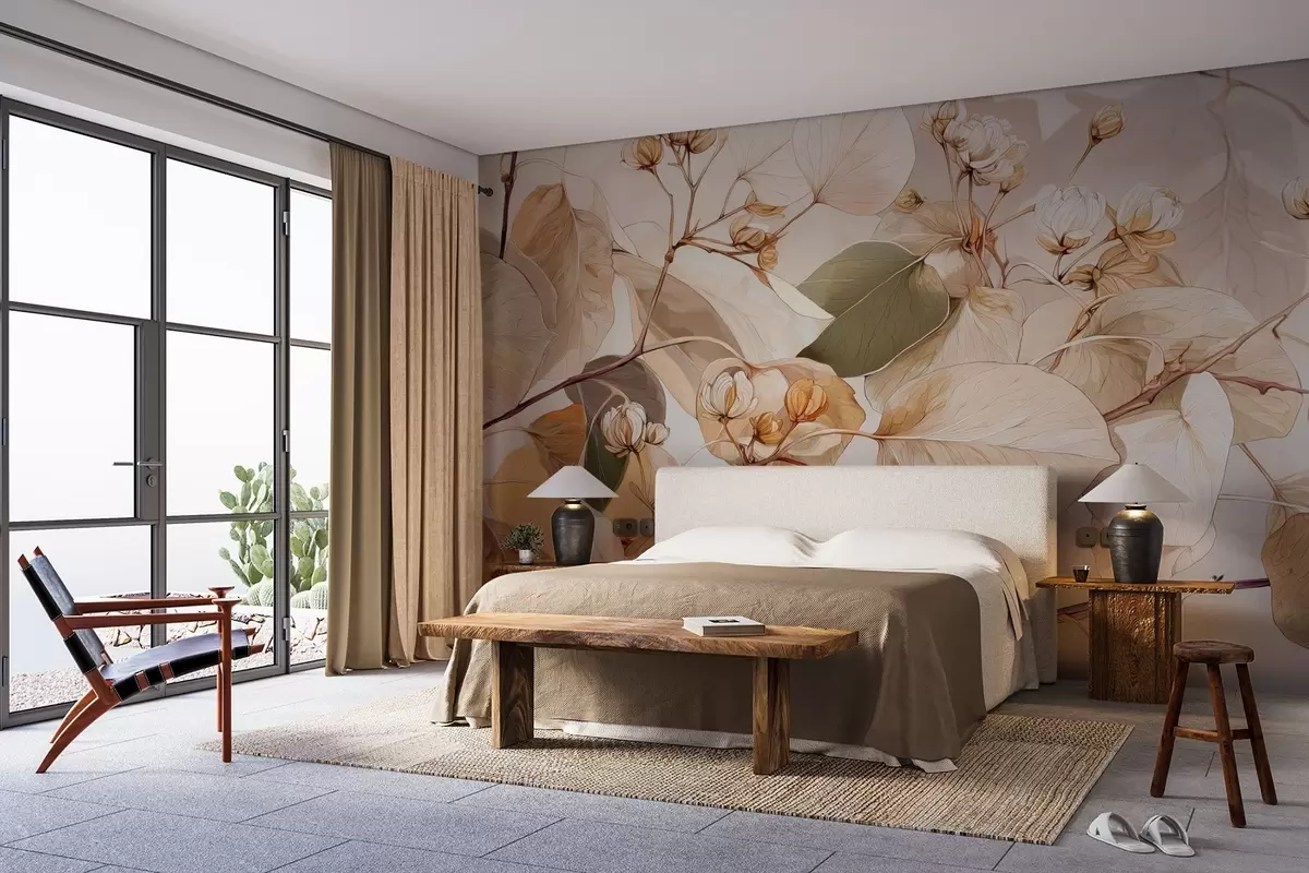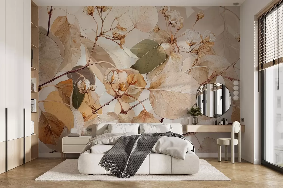 Fotomurales Ramas de hojas y flores de álamo temblón al óleo en tonos beige Nr. w09082