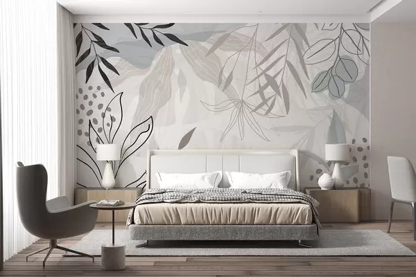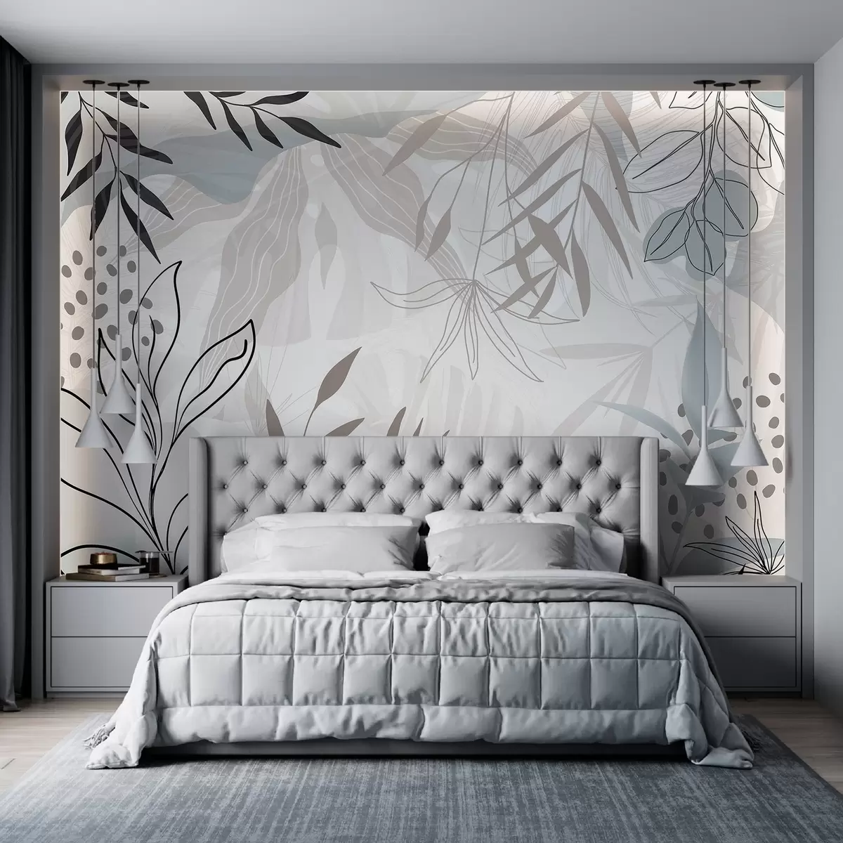 Fotomurales Diseño floral abstracto moderno con hojas de color beige pastel, gris, azul y negro, delicado arte lineal y fondo suave Nr. w09105