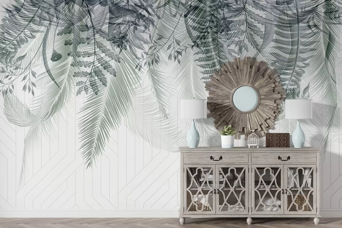 Fotomurales Delicada caída de helechos tropicales y hojas de palmera, fondo geométrico, luz suave, colores apagados, elegante Nr. w09106