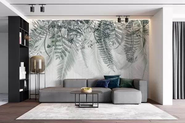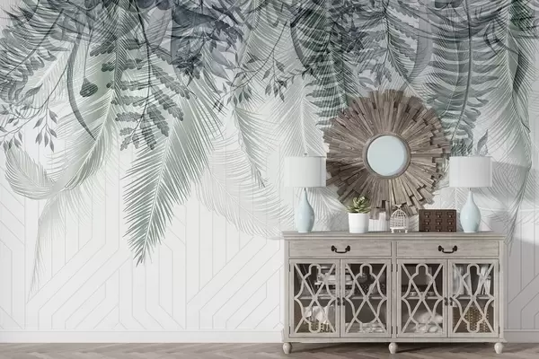 Fotomurales Delicada caída de helechos tropicales y hojas de palmera, fondo geométrico, luz suave, colores apagados, elegante Nr. w09106