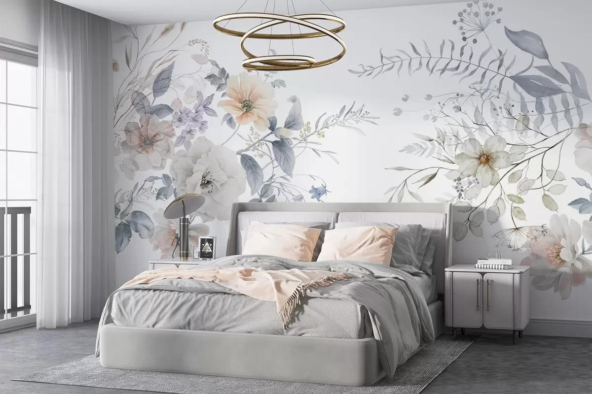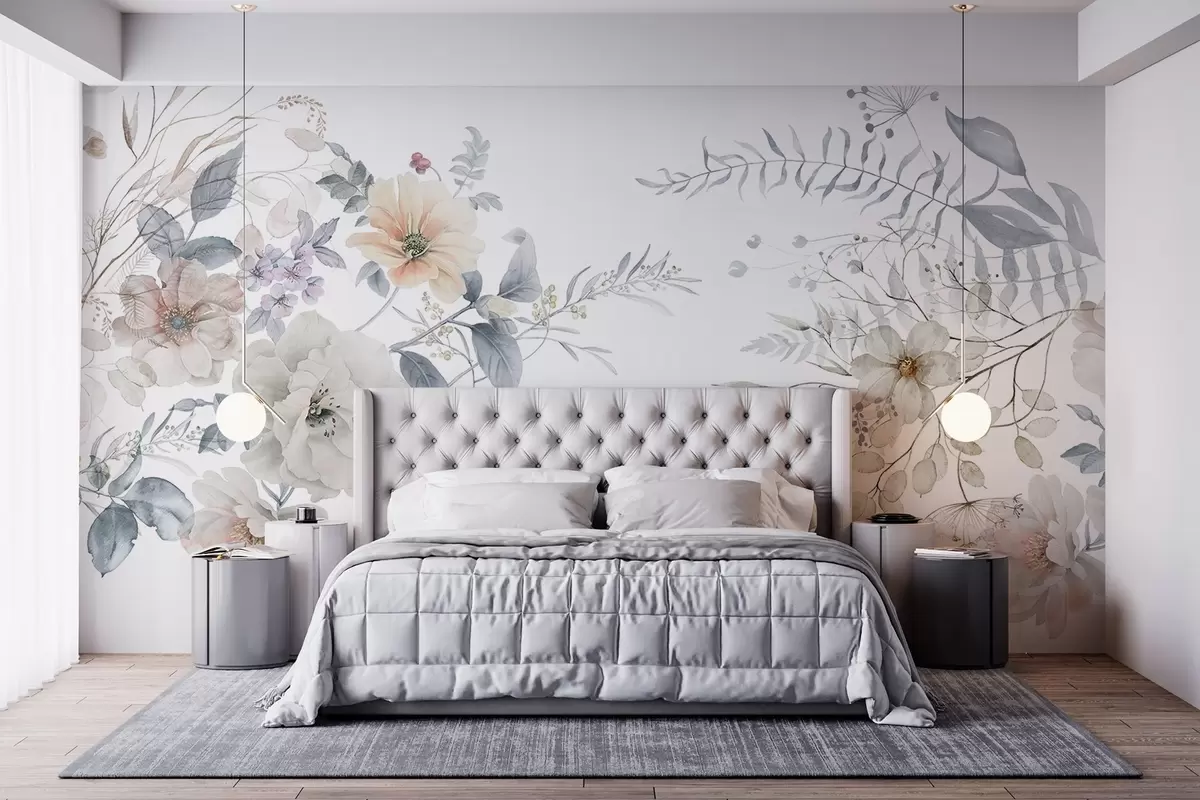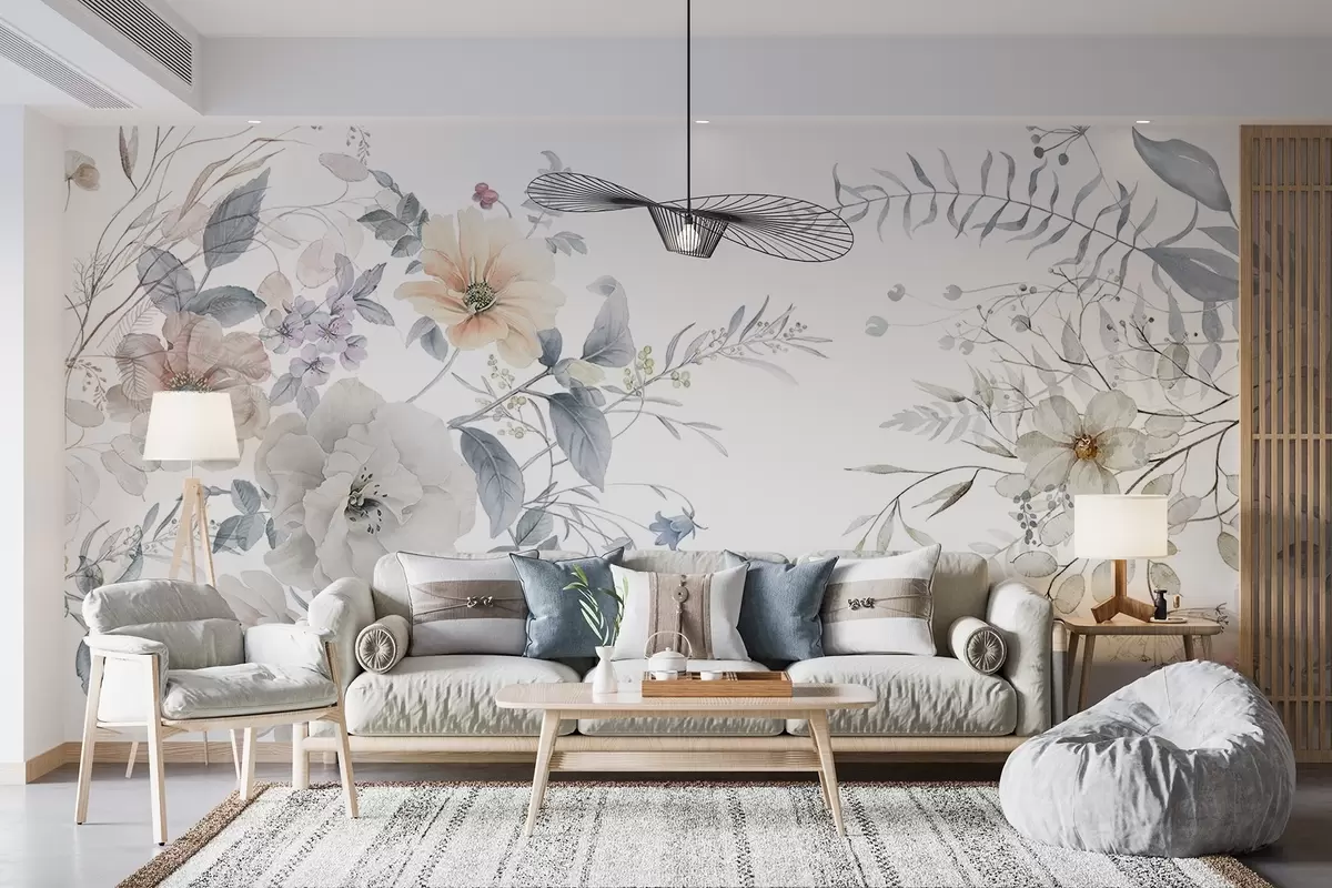 Fotomurales Arreglo floral en estilo de pintura de acuarela con flores blancas, melocotón y azul, delicada vegetación sobre fondo blanco Nr. w09108