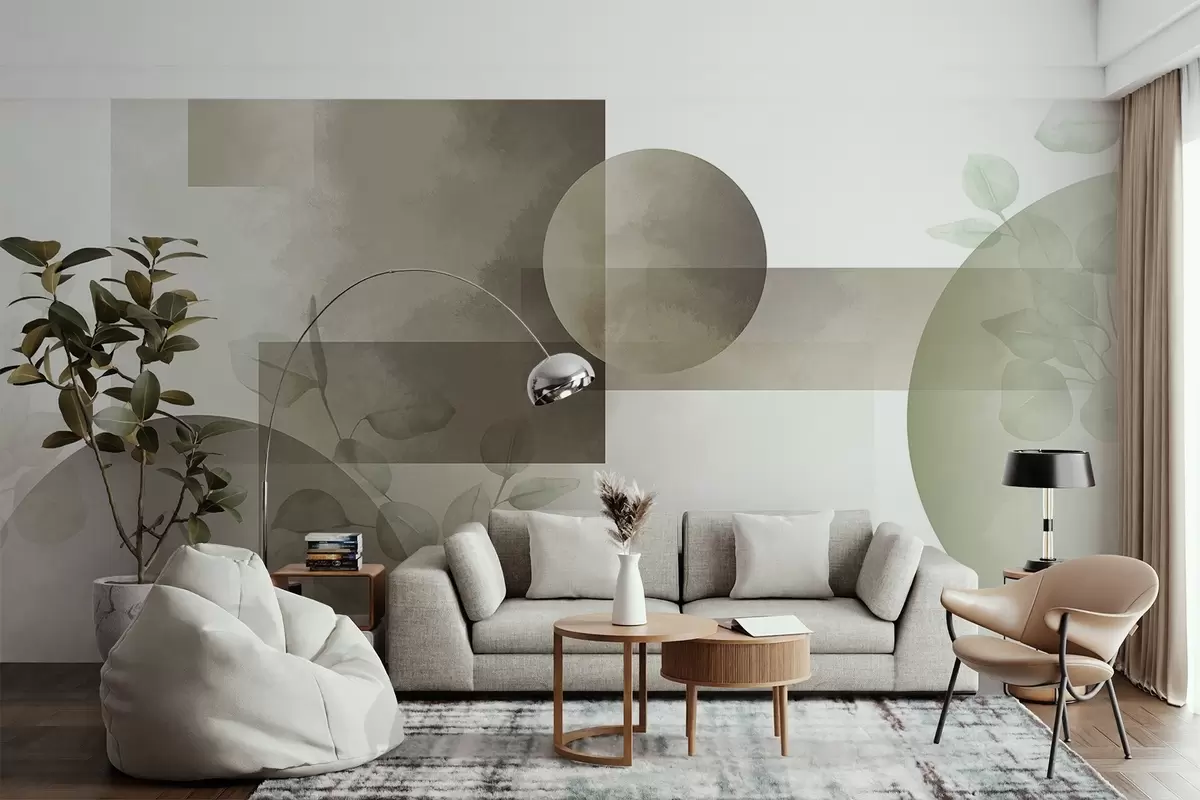 Fotomurales Diseño geométrico minimalista moderno abstracto con círculos y rectángulos, hojas de eucalipto, efecto acuarela Nr. w09110v1