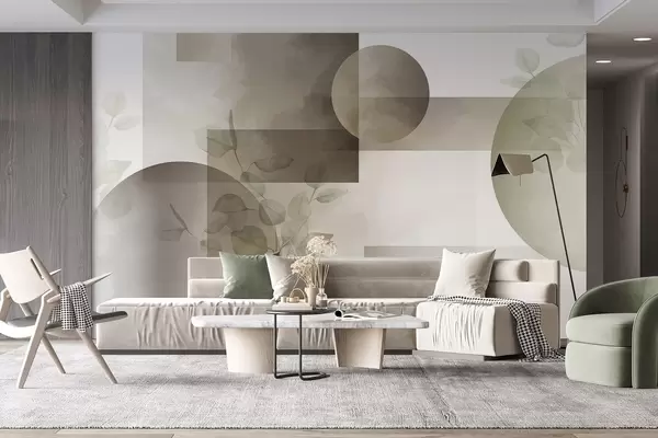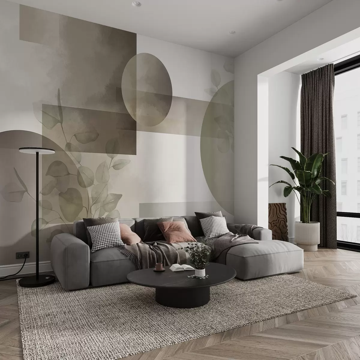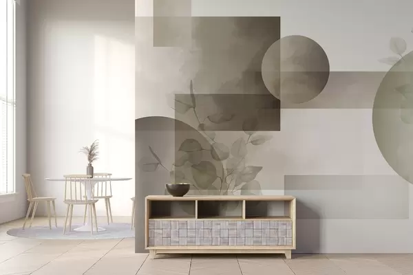 Fotomurales Diseño geométrico minimalista moderno abstracto con círculos y rectángulos, hojas de eucalipto, efecto acuarela Nr. w09110v1