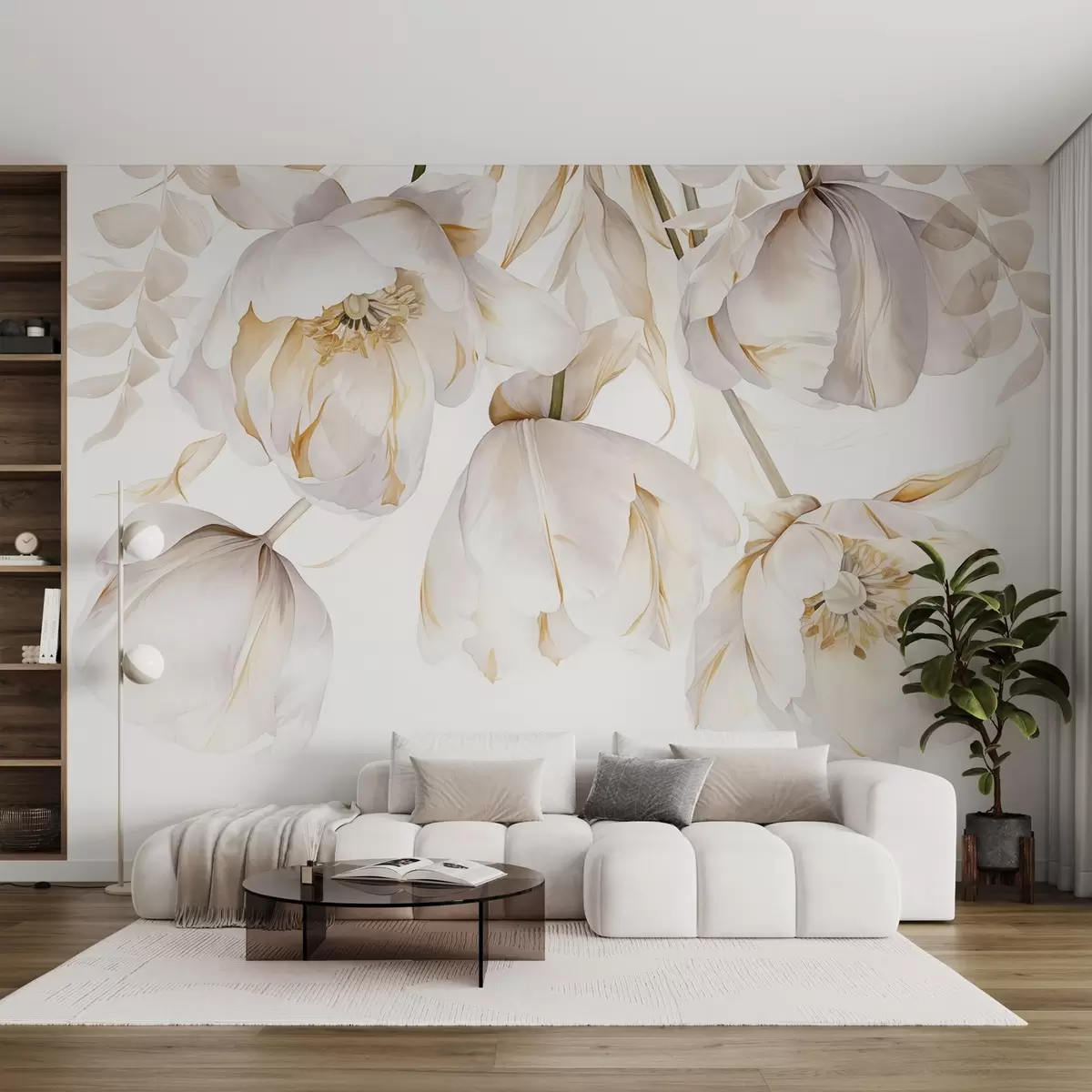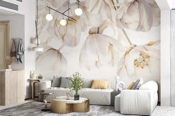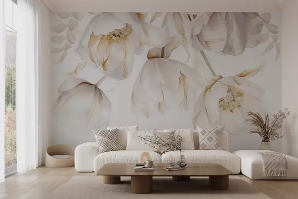 murales de pared Tulipanes blancos con pistilos amarillos, delicados pétalos, elegante arreglo floral, delicada composición, sobre fondo blanco w09112