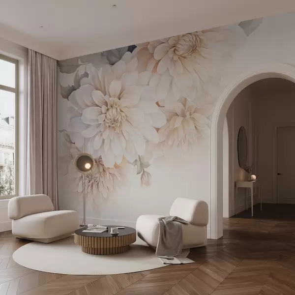 Fotomurales Dalias pastel con pétalos suaves y delicados de color melocotón y blanco claro en estilo acuarela, fondo suave Nr. w09115