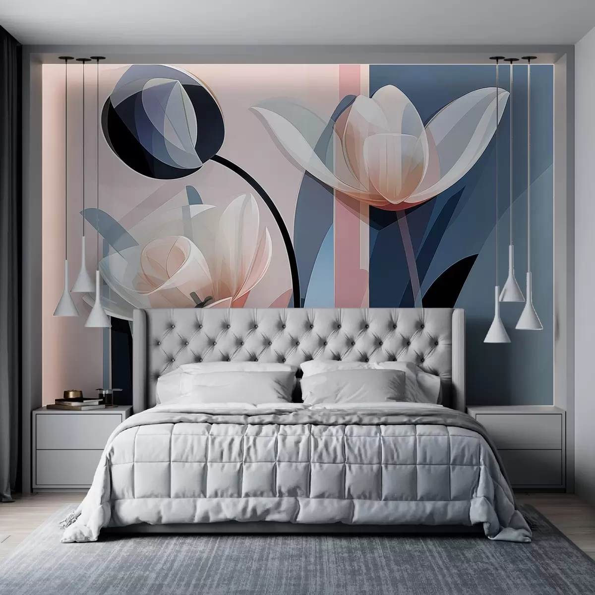 Fotomurales Diseño moderno abstracto con tulipanes de pétalos transparentes en tonos pastel rosa, blanco y azul oscuro Nr. w09116