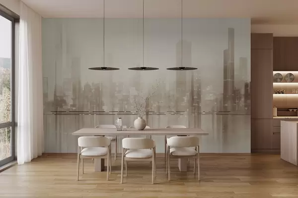 Fotomurales Paisaje urbano abstracto texturizado con edificios altos y bandas, en tonos beige y blanco, creando un efecto brumoso Nr. w09119v1