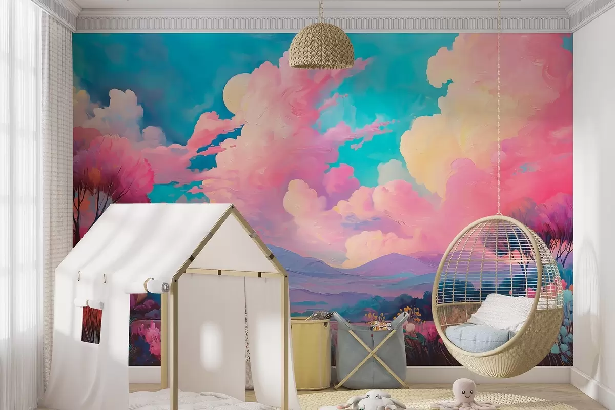 Fotomurales Colorido paisaje al óleo con cielo rosa, plantas y árboles Nr. w09123