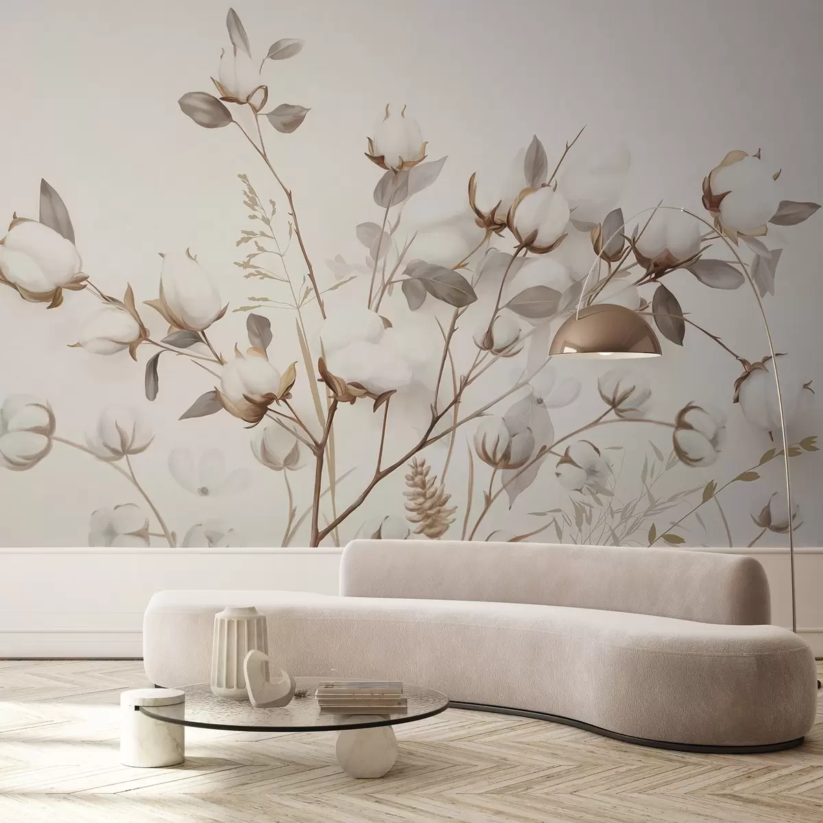 Fotomurales Flores de algodón con tallos y hojas en una paleta de color marrón claro, fondo beige, suave y delicado, estilo acuarela Nr. w09141