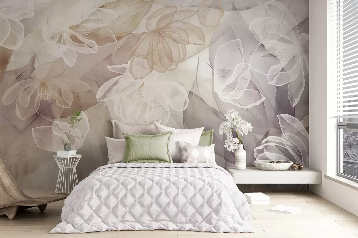 Fotomurales Flores y hojas con pétalos transparentes en tonos blancos, beige y morados, suaves y delicados Nr. w09158