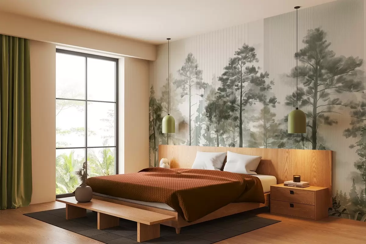 Fotomurales Un denso bosque con altos pinos, exuberante follaje verde, una atmósfera brumosa con texturas de líneas verticales Nr. w09163