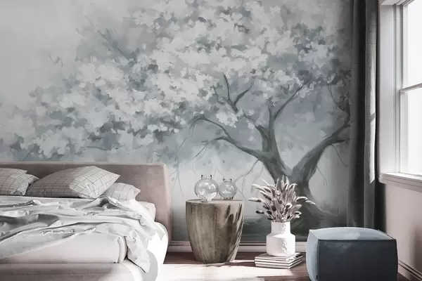 Fotomurales Abstracto árbol en flor azul apagado en plena floración, junto a un río, pinceladas de textura suave y colores pastel Nr. w09193v2