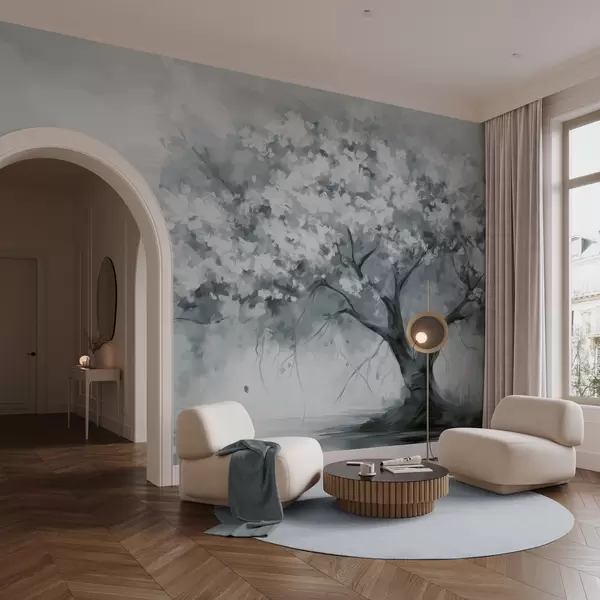 Fotomurales Abstracto árbol en flor azul apagado en plena floración, junto a un río, pinceladas de textura suave y colores pastel Nr. w09193v2