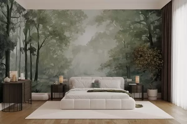 Fotomurales Paisaje forestal texturizado, árboles con hojas verdes, paleta de colores pastel Nr. w09210v2