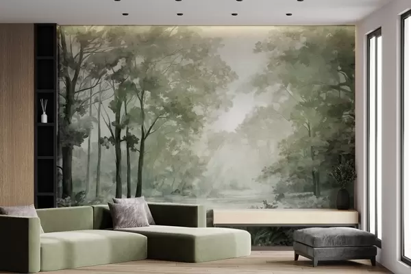 Fotomurales Paisaje forestal texturizado, árboles con hojas verdes, paleta de colores pastel Nr. w09210v2